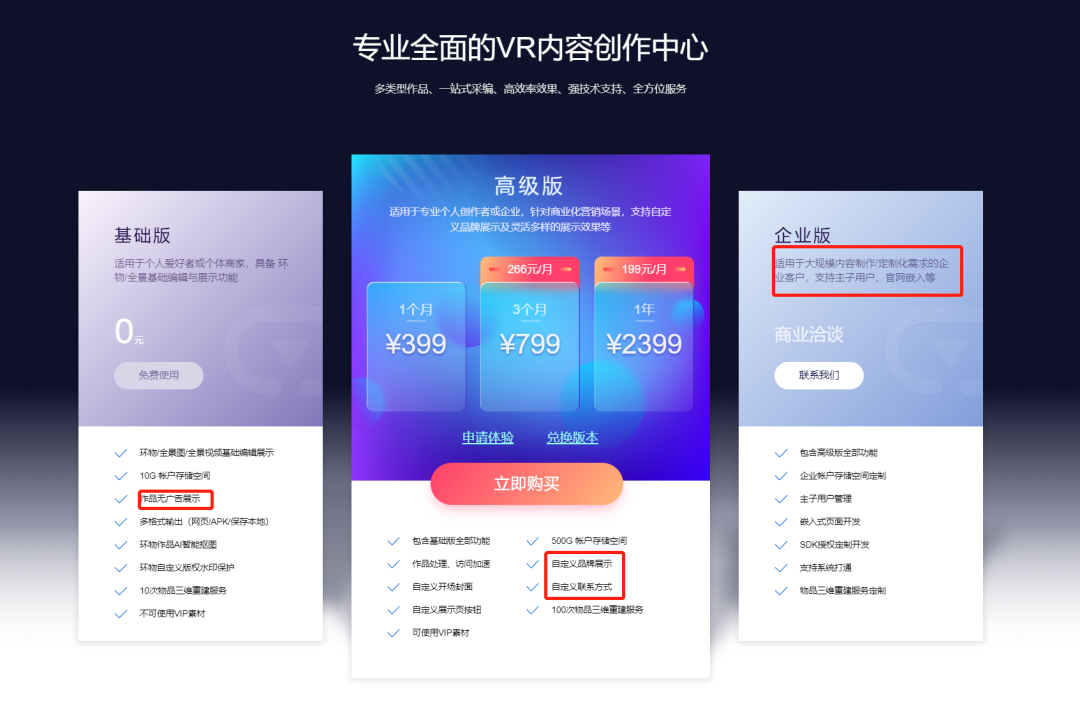 高级版,适用于专业个人创作者及企业,可用于自定义品牌展示等商业化数字营销场景,同时,账户存储空间500G,100次物品三维重建服务,还可自定义联系方式(方便用户联系商家),收费标准为每个月399元,订阅时间越长,价格越优惠;