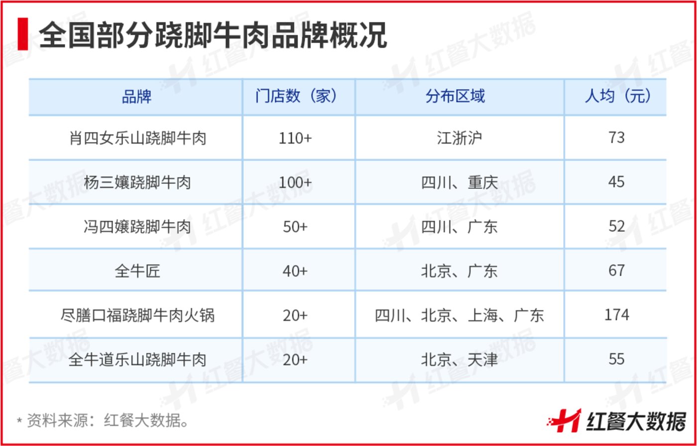 还有杨三孃跷脚牛肉,去年新增40多家门店,目前总门店数100+家,主要分在四川、重庆等地。此外还有四川的冯四嬢、北京的全牛匠、广东的尽膳口福等品牌,在当地都小有知名度。其中肖四女(上海黄陂南路店)、乐山胖哥(成都东风路总店)还登上了“大众点评2022必吃榜”。