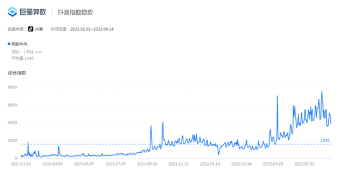 跷脚牛肉的逆势增长肉眼可见。巨量算数显示,从去年夏天开始,跷脚牛肉的抖音综合指数快速上升,今年五月之后再创新高。而在小红书上,关于“跷脚牛肉”的笔记也有4万+篇。