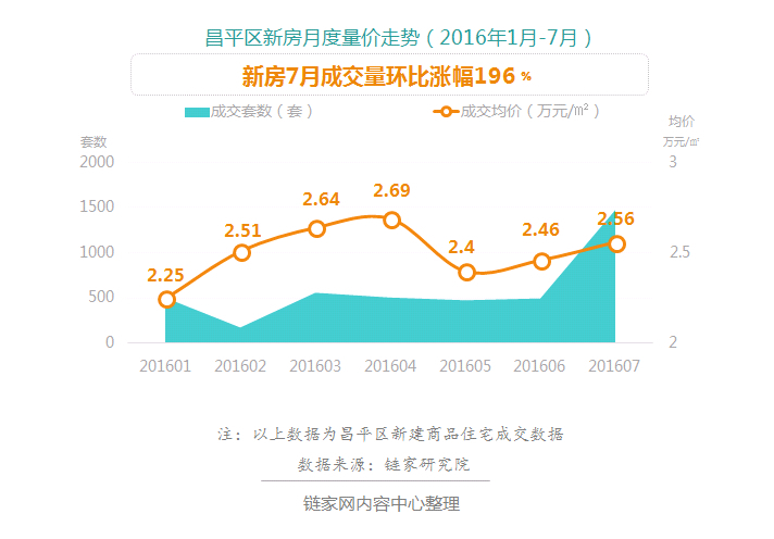 2016年上半年(1月-7月),昌平区新房成交量不断攀升,7月创新高,达1475套,环比上月,成交量涨幅196﹪,新房市场火热。