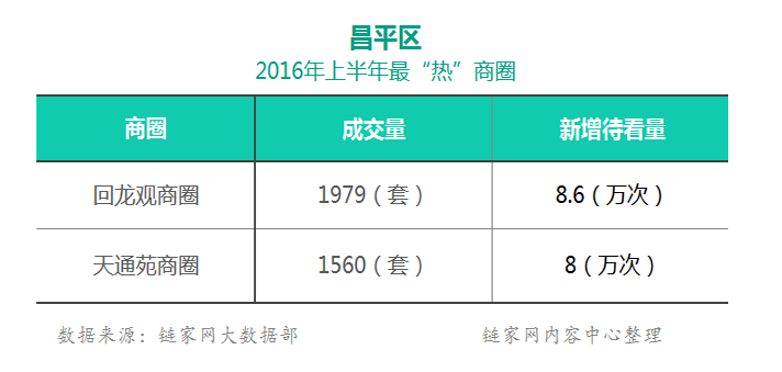 据链家大数据显示:2016年上半年,二手房市场最“热”的三大商圈,昌平区占据了2个,分别回龙观商圈和天通苑商圈,分别摘得“状元”和“榜眼”的称号。