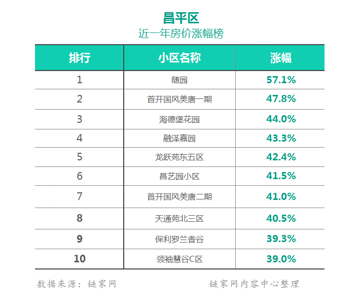 近一年,昌平区涨幅前三小区分别是随园、首开国风美唐一期、海德堡花园。其中,随园涨幅过半,成为昌平区近一年涨幅最大的小区。