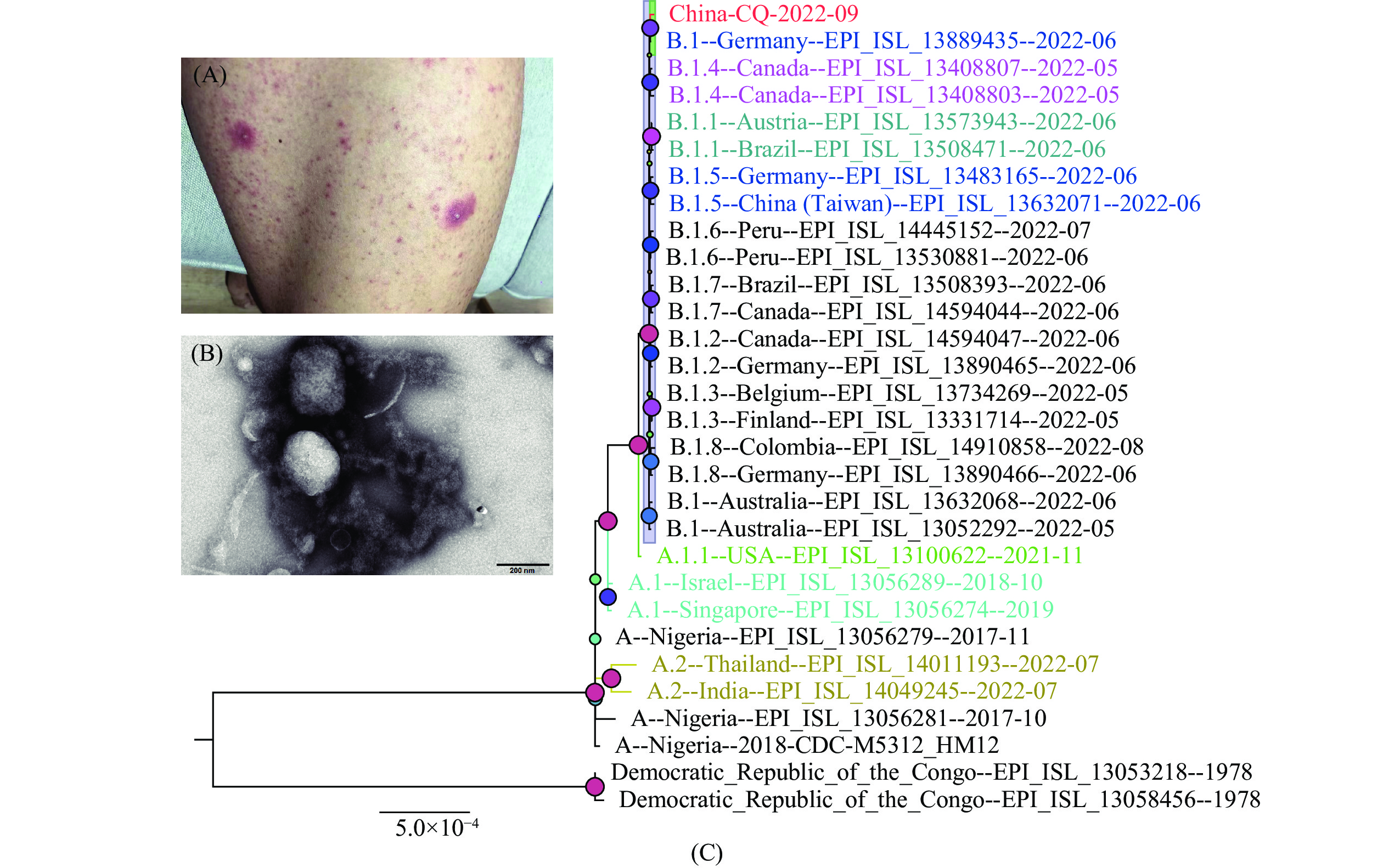 经过对该病例水疱液、鼻咽和口咽拭子在内的临床标本以及血液样本进行基因测序,结果显示该病例所感染毒株属于西非谱系的B.1分支,与2022年6月21日从德国采集的菌株高度同源。该病例也是继中国台湾和中国香港特别行政区报告输入性猴痘病例以来中国报告的第5例人类猴痘感染确诊病例。