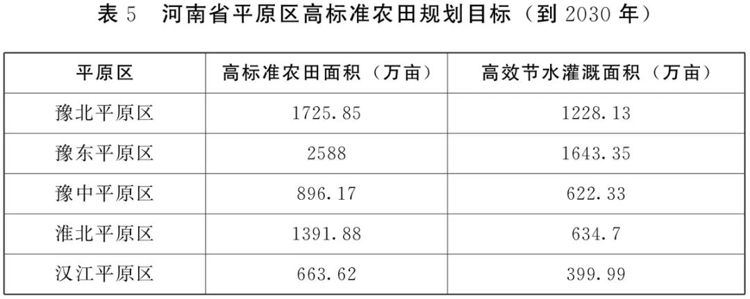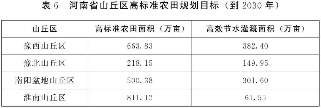 规划到2030年新发展高标准农田面积1876.46万亩,高标准农田总面积达到7265.51万亩,高标准农田率达到86.53%;新发展高效节水灌溉面积2546.4万亩,高效节水灌溉总面积达到4528.5万亩,高效节水灌溉率达到62.33%。