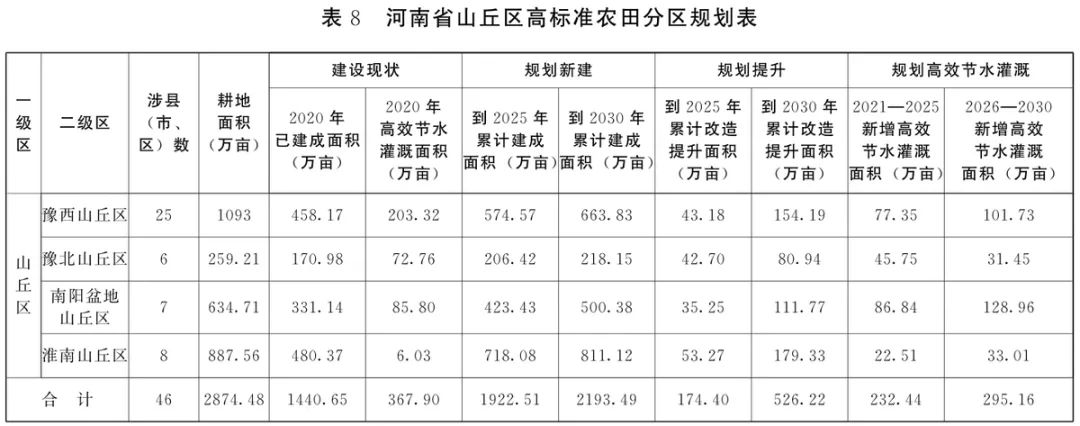(二)山丘区。范围包括豫西山丘区、豫北山丘区、南阳盆地山丘区和淮南山丘区等,涉及46个县(市、区),耕地面积2874.48万亩,占全省耕地面积的25.5%;已建成高标准农田面积1440.65万亩,占全省已建成高标准农田总面积的21.1%,可发展空间1433.83万亩。