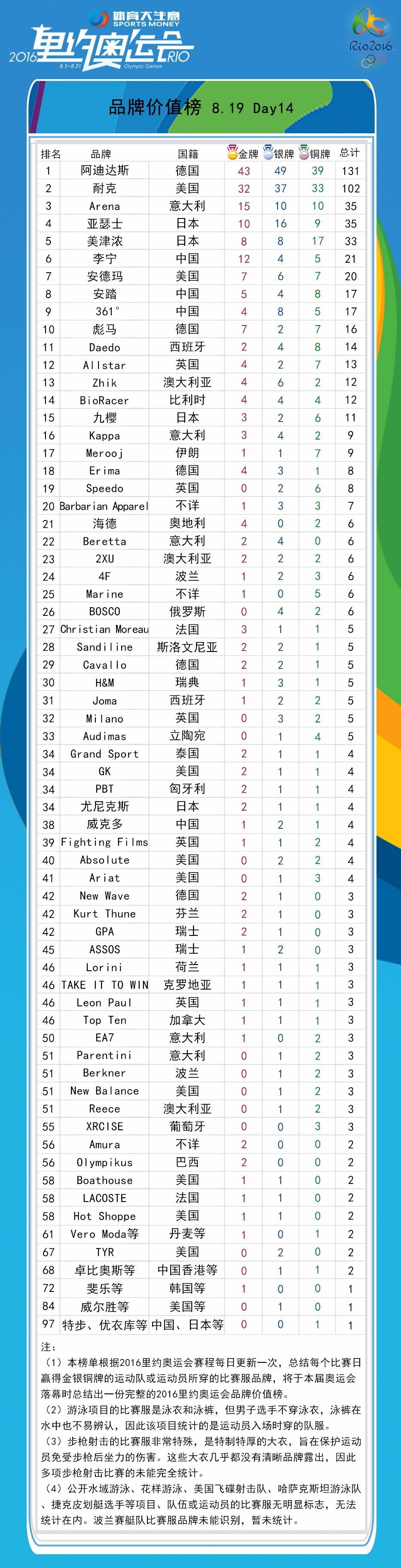 2016年里约奥运进入倒计时时间,同时体育大生意奥运特辑《奥运品牌价值榜》也进入尾声,在这里小编感谢大家的鼓励与陪伴,希望大家继续支持体育大生意。本期的品牌价值榜依旧竞争惨烈,像中国品牌李宁与海外代表安德玛正处于白热化比拼。且听小编为您一一道来。