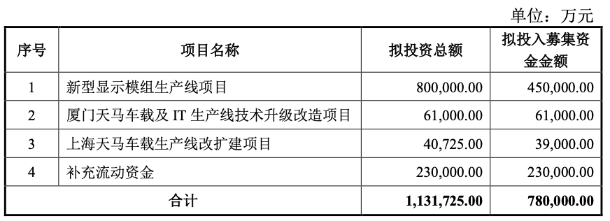 近日,深天马A发布2022年度非公开发行A股股票预案,拟定增募资不超过78亿元,用于新型显示模组生产线项目、厦门天马车载及IT生产线技术升级改造项目、上海天马车载生产线改扩建项目、补充流动资金。