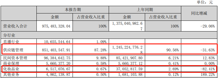 *ST大通的业务分为生物工程及衍生功能性健康消费品、供应链服务和民间资本管理、互联网营销平台三大业务板块。今年上半年公司实现营业收入9.75亿元,同比下降29.06%;实现归母净利润7283.24万元,同比上升162.29%。其中,供应链管理业务实现营业收入8.51亿元,同比下降31.63%,化妆品业务实现营业收入651.71万元,同比下降82.41%。