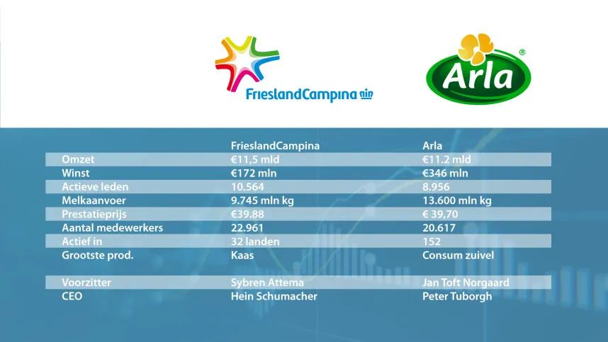 菲仕兰的总部位于荷兰的阿默斯福特,为荷兰、比利时和德国的1.5万名奶农所拥有;Arla在七个欧洲国家拥有大约1万名奶农。两者去年的收入分别为115亿欧元和112亿欧元,但是Arla的净利润(3.46 亿欧元)是菲仕兰(1.72 亿欧元)的两倍。