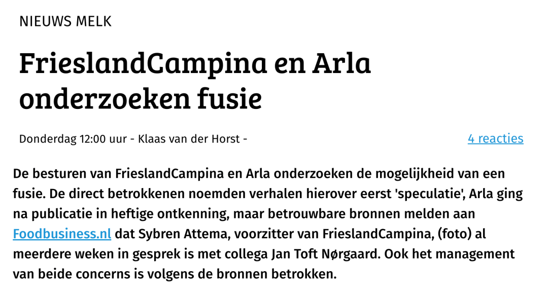 我们先看看这则传言。根据最先发布该消息的荷兰杂志Boerenbusiness(下图)的说法,荷兰最大的乳制品集团菲仕兰和丹麦乳制品巨头Arla Foods正在就可能的合并进行谈判。