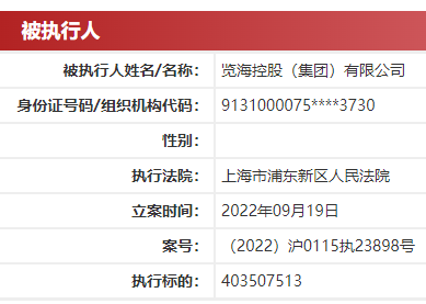 中国执行信息公开网显示,2022年9月19日,览海控股(集团)有限公司新增一则被执行人信息,执行标的约4.04亿元,执行法院为上海市浦东新区人民法院。天眼查显示,截至目前,该公司已累计被执行超11亿元。