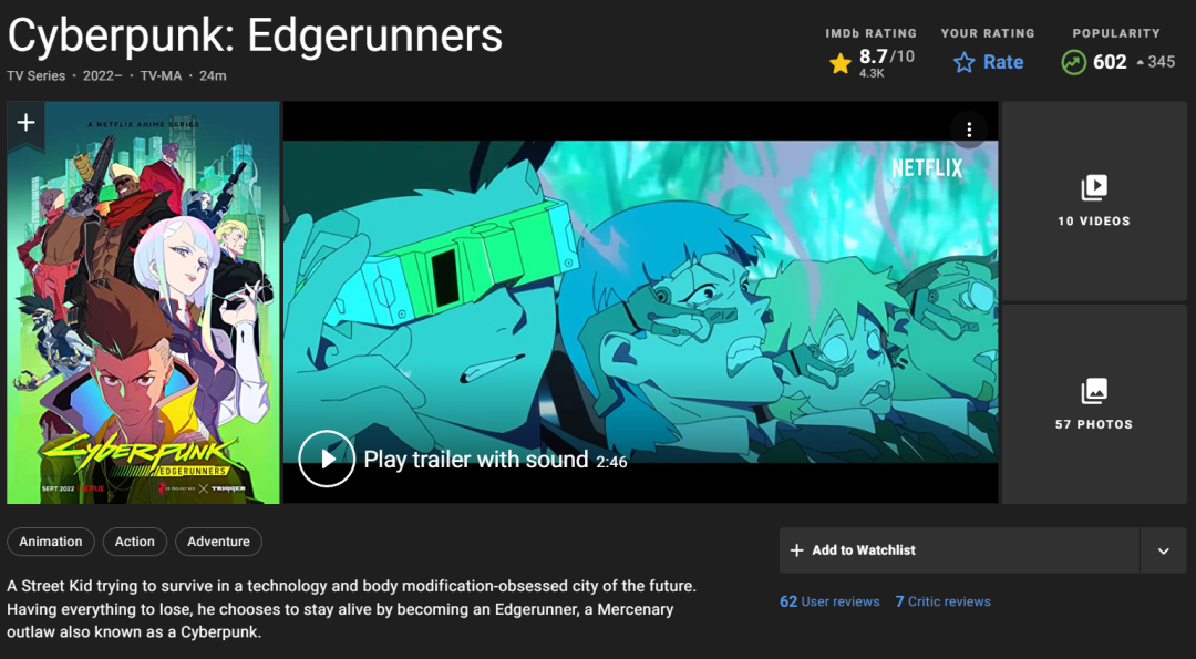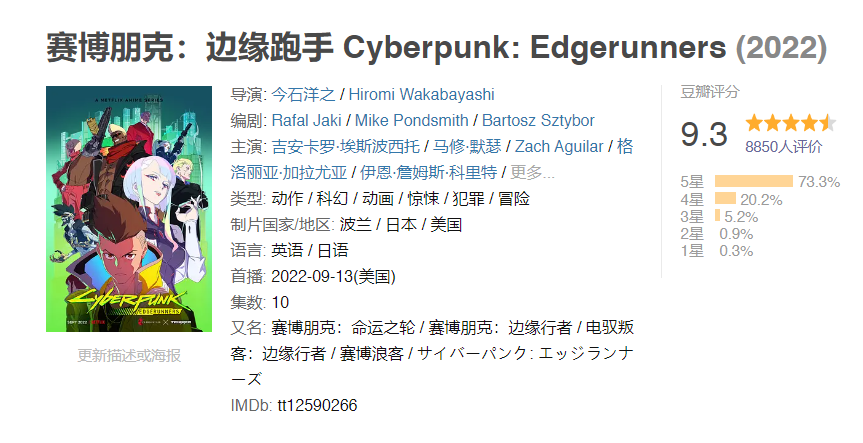 9月14日,《赛博朋克:2077》(以下简称《2077》)的衍生动画《 Cyberpunk: Edgerunners》(《赛博朋克:边缘行者》下简称《边缘行者》)在Netflix上一次性放出全部10集。在《赛博朋克:2077》贴吧里,有关动画剧情、人物相关讨论贴多达数页,差点让人误以为这是《赛博朋克:边缘行者》动画贴吧。在IMDB上,动画评分为8.7分,豆瓣的开分则是9.3分,无论是游戏玩家还是普通动画观众,都对这部动画评价颇高。