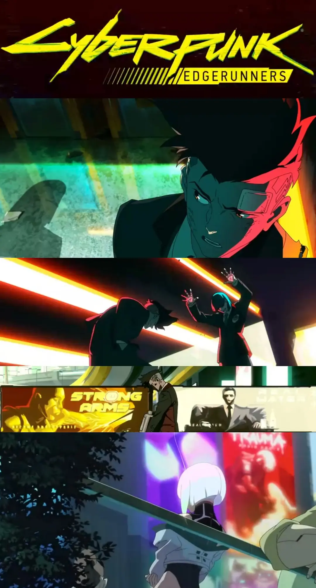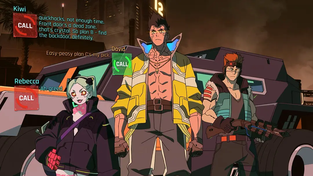 从主角大卫·马丁内斯的名字、可更换的义体、荒坂集团、军武科技、武器名称、游戏UI界面,赛博精神病,到最终Boss亚当·重锤,以及数个动画场景都复刻自游戏内容,通过大卫的故事线,将这一切游戏要素串联起来。在游戏要素之外,则是如何站在动画角度讲好这个发生在赛博朋克世界里的故事。