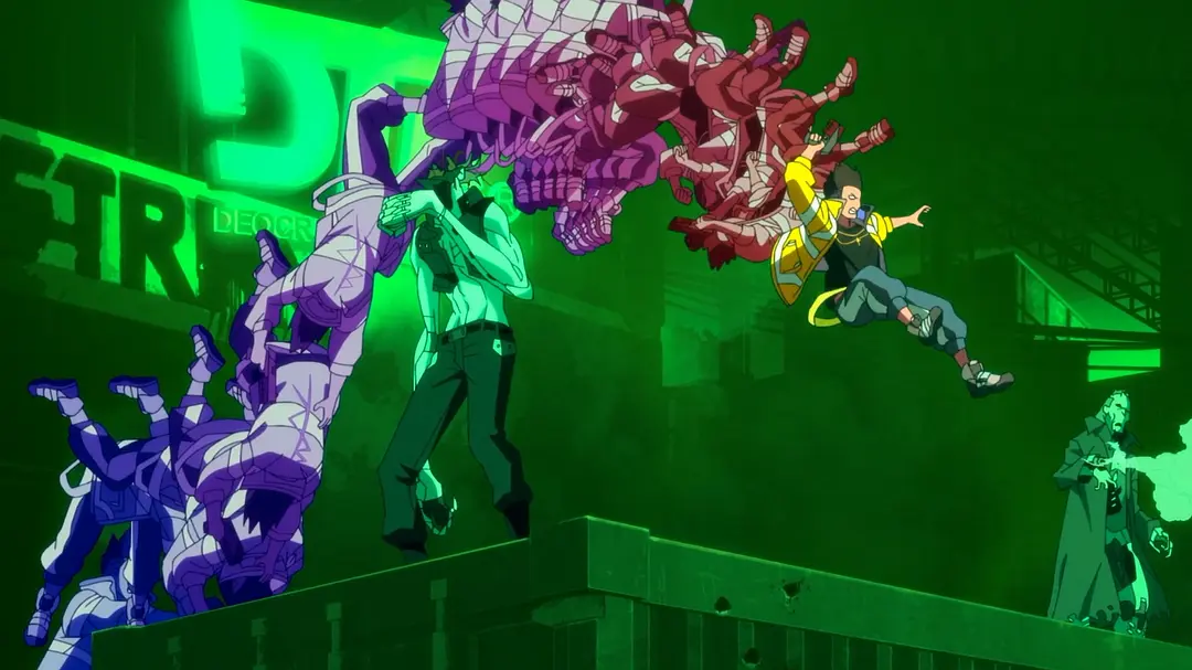 从动画成片来看,扳机社以及导演今石洋之一如既往独特的美术风格和强烈的视觉冲击,与《2077》描绘的赛博朋克世界倒是非常搭。燃爆的打斗画面、大胆的色彩运用配合出色的BMG,充分再现了游戏里亦真亦幻的夜之城。