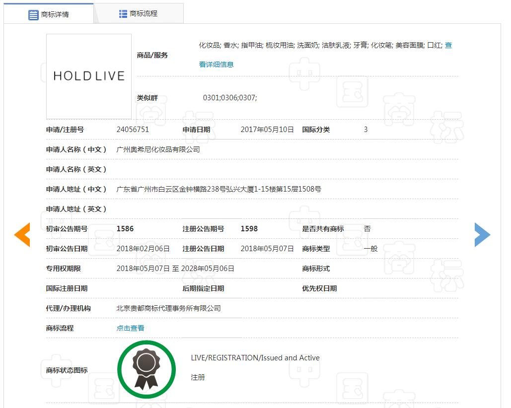 根据中国商标网信息显示,广州奥希尼于2018年5月获得了HOLD LIVE第3类化妆品商标的注册申请。另据国产普通化妆品备案信息平台信息显示,HOLD LIVE旗下产品的备案人为广州奥希尼。