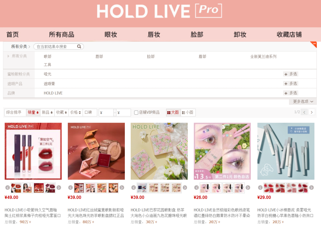 据悉,holdlive天猫旗舰店上的产品分为眼妆、唇妆、脸部、卸妆等4类产品,商品数量约为80件,其中销量最高的产品为HOLD LIVE持久空气唇釉,总销量已超过90万件。此外,小红书上关于HOLD LIVE的笔记也超过了1万篇。