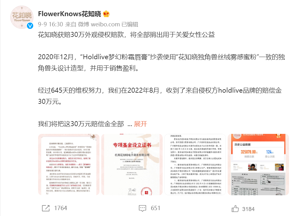 近日,彩妆品牌花知晓发布消息称,长达2年的维权终于成功,已获侵权方HOLD LIVE品牌30万元赔偿金。