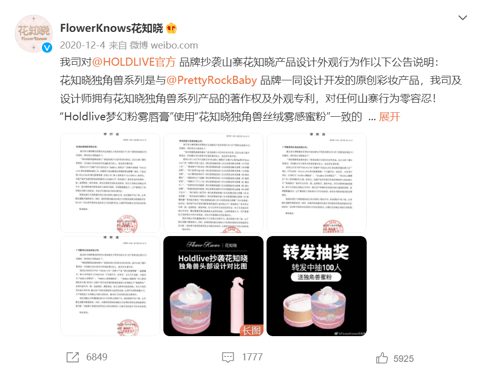 花知晓在公告中称,“‘HOLD LIVE梦幻粉雾唇膏’涉嫌使用了‘花知晓独角兽丝绒雾感蜜粉’一致的独角兽头设计造型”,而花知晓独角兽系列是该品牌与PrettyRockBaby品牌一同设计开发的原创彩妆产品。