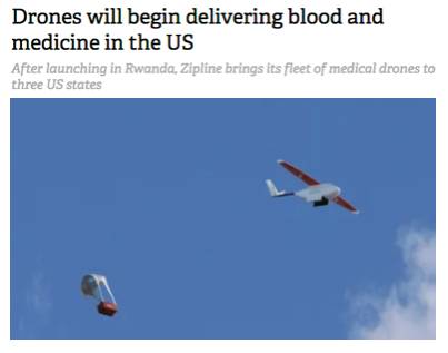 创业公司 Zipline 在用无人机向不同道路的偏远村庄运送医疗物品。