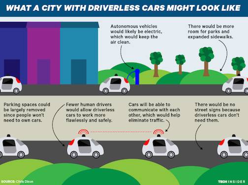 正如汽车已在 20 世纪重塑了整个世界一样,自动驾驶汽车在 21 世纪也将会改变整个世界。在大部分城市,其 20-30% 的可用空间都被用来停车了,而绝大部分汽车 95% 的使用寿命都浪费在了停车状态。自动驾驶汽车则可具备持续不停的使用状态(可能用某个智能手机应用即可设定),从而大幅降低其停车的需求。汽车彼此之间将能够相互通讯,以避免交通事故或路面拥堵,而乘客则可将通勤时间用于其他活动,如工作、教育与社交。
