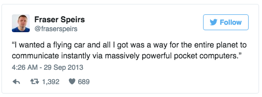 “我想要一辆飞行汽车,而我所能得到的只是一个让全球通过大规模高性能的便携式计算机进行即时通讯的方式。”