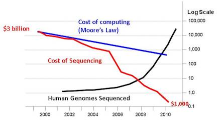 举例来说,仅仅 15 年前,测序一个人的基因组要花掉 30 亿美元。而今天,这一费用仅需大约 1000 美元,且还将继续降低。基因测序很快会成为医学的一个常规部分。