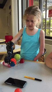 计算机在医学上的另一个用途是假肢。这里有一个小女孩使用假手的情景,她是用上臂的肌肉来控制它的: