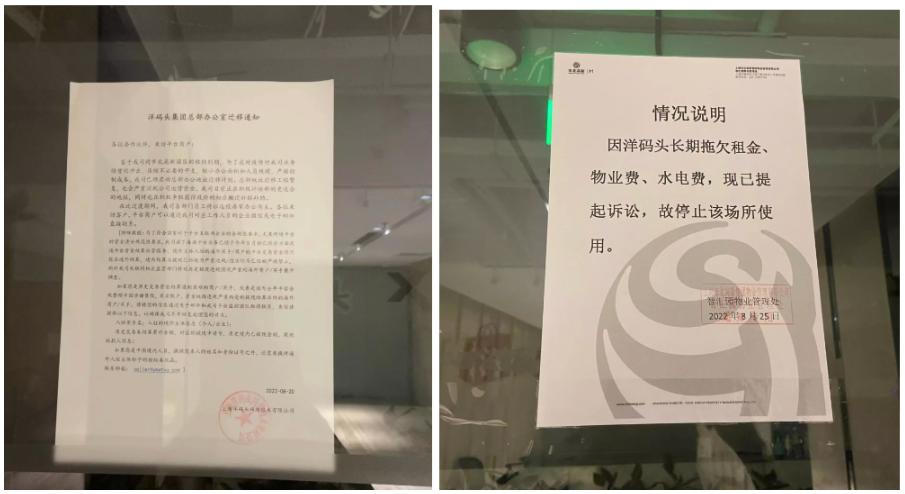 Tech星球9月15日实地探访时发现,洋码头曾经的总部大门紧闭,只贴着两张告示。一张来自物业,上面写着“因洋码头长期拖欠租金、物业费、水电费,现已提起诉讼,故停止该场所使用”,另一张来自洋码头公司,上面写着“为压缩不必要的开支,我司启动总部办公地址迁移计划,过渡期间,洋码头将采取远程居家办公。”
