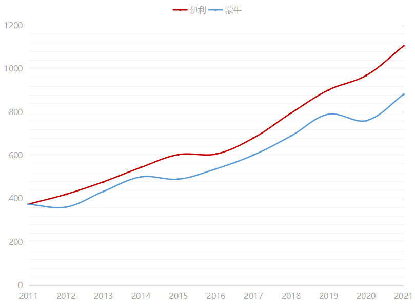 10年前的2011年,蒙牛和伊利的营收差距仅有0.63亿元;10年后的2021年,两者差距扩大到了224.54亿元。从这个趋势上看,伊利的理解可能更接近于真相。