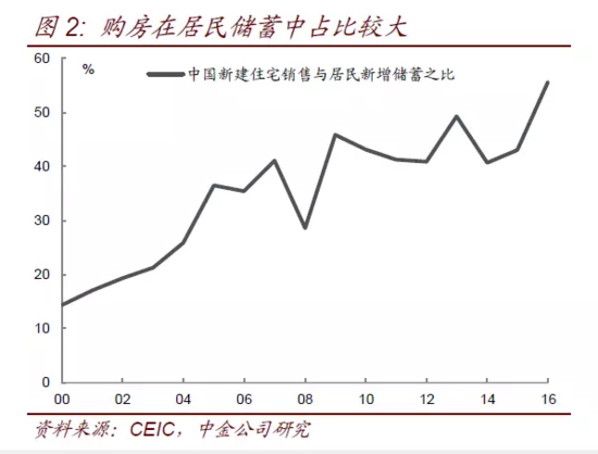 再者,由于居民购房具有投资属性,居民购房本质上是储蓄行为,我们考察居民购房在居民新增储蓄中的比重,需要指出的是这里的储蓄是指住户可支配收入中减去消费支出的部分,2015年商品住宅销售与居民新增储蓄之比为43%,2016年可能升至57%,相当于居民储蓄中的一半用于购房(图2)。