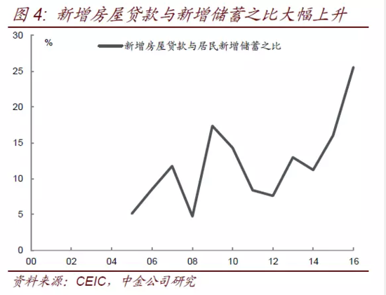关于居民购房还有讨论较多的一点是居民按揭贷款大幅增长的问题。假设未来几个月按揭贷款保持较快投放,今年年底个人房屋贷款余额可能达到19.2万亿,相当于居民可支配收入的41%,较2015年的33%大幅增加,个人房屋贷款余额与个人存款余额之比也从2015年的26%大幅升至32%,尽管目前按揭贷款规模并不会带来多大风险,但这样的增长速度肯定是无法持续的。我们同时计算新增房屋贷款规模与新增储蓄之比从2015年的16%大幅升至26%,明年新增房屋贷款规模明显放缓的可能性较大(图4)。