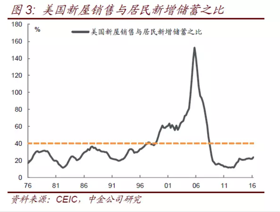 事实上,可以把广义住户部门储蓄投资理解为居民资产配置行为,可以将新建住宅销售额与居民新增储蓄之比理解为居民新增资产中配置房地产的比例。从美国历史情况看,一般新屋销售与居民新增储蓄之比不超过40%,2000-2008年大幅上升曾带来严重的房地产泡沫(图3),我国居民配置房地产意愿更强,但占比持续上升仍隐含较大的风险。注意到我们没有考虑二手房销售,因为二手房销售可以认为只涉及住户部门内部收入转移,不影响我们对住户部门整体的考察。