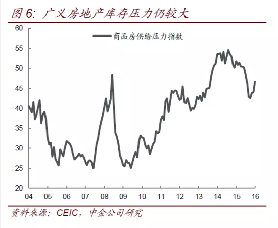 三是广义房地产库存仍在高位,商品房销售良好使得可售库存持续下降,但由于房屋新开工面积仍大于商品房销售面积,广义房地产库存仍在累积,一旦商品房销售放缓,房地产库存压力将再次明显显现,在这个背景下很难说企业对房地产市场的长期预期改善(图6)。
