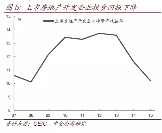 二是房地产开发投资回报持续下降,尽管房地产价格上涨,但土地价格上涨更快,房地产开发企业投资回报反而出现下降,2015年上市房地产开发企业ROE从2014年的11.6%降至10.2%,今年上半年也并没有明显提升(图5)。