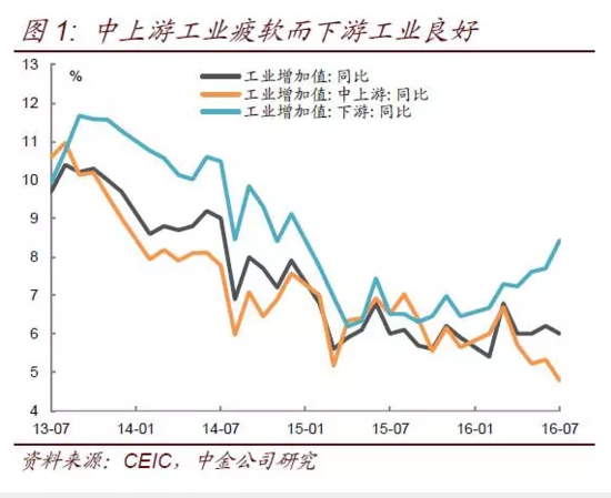 通过计算中上游和下游工业增加值,可以看到中上游行业增加值同比增速从6月的5.3%降至4.8%,下游行业增加值同比增速从6月的7.7%升至8.4%,工业经济表现为中上游疲软而下游良好,并且注意到这个现象从二季度开始就在持续(图1)。