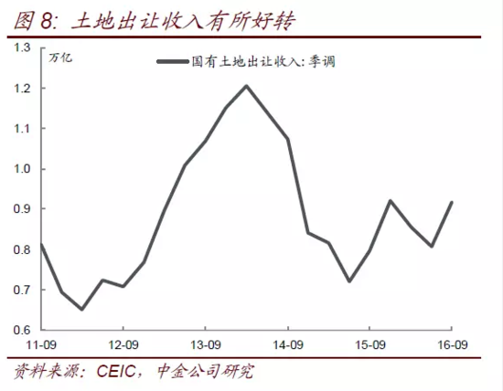 本轮房地产上行周期走过两年之后,一二线城市房价已大幅上涨,政府再次处在一个比较纠结的位置,近期苏州南京收紧二套房政策,七部委严查首付贷,都可以作为侧面印证。不过,与过去周期不同的是,政府难以出台较强的调控政策,因为经济前景实在不乐观,一般财政收入放缓也使得地方财政对土地出让的依赖仍然较大(图8)。