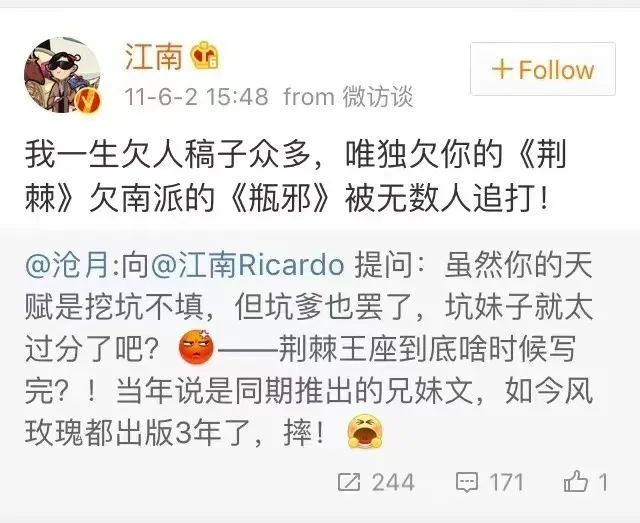 成名网文作家的更文节奏可以达到一天万字,而江南曾经多次在微博评价自己“写得很慢”:“出版速度也就是一年一本到一本多点,过去的几年里我们多番尝试也没能突破这个速度限制,现在依旧突破不了,所以没法催。”