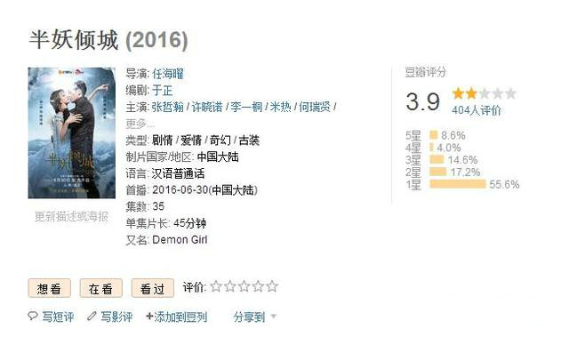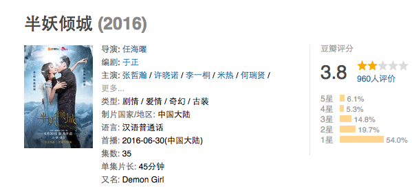 在连续更新四集之时,豆瓣一度没有打分,原因是评价人数不够。在更新6集后,《半妖倾城》豆瓣评分3.9,秉着“好剧可能都在后程起波澜”的心态一直观望到最后,玛丽苏的剧情和繁复审美的画风,不但没让评分走高,反而在即将迎来大结局的时候,豆瓣评分掉到了3.8。(不过幻城2.9,赢了一局)