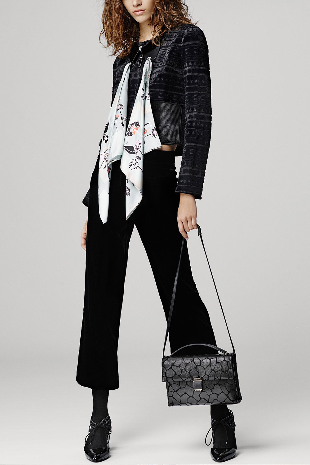 裤子的长度遮盖脚背,搭配一双粗跟拼接高跟鞋,整体造型充满力量。