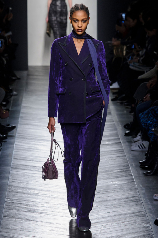 若是想显得休闲一些,西装里可以配一件T恤或是高领针织。若是想集魅力与性感多一些,西装里不穿是最好的选择,让自然的肤色露一些出来,腰带可用来做收腰作用,也可以围绕在脖子间,流行的睡衣风与天鹅绒结合,打造出更具秋日氛围的浪漫新装。