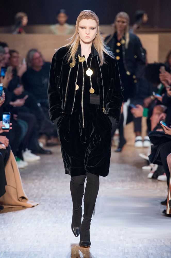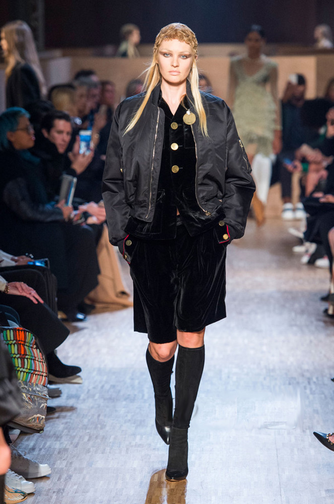 华美的黑丝绒无法为时装塑出坚挺的轮廓,但依旧不妨碍让姑娘们看起来很酷!搭配重金属的配饰,翻领隔绝了露肉的一切机会,搭配棒球夹克更有街头随性的时髦感。