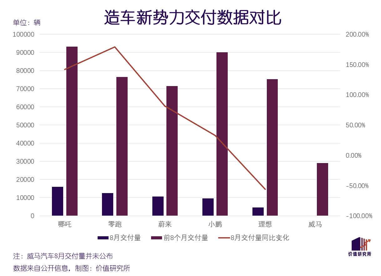 8月份,国内新能源车销量最高的品牌是比亚迪和广汽埃安两家传统车企,两者的交付量分别达到17.49万辆和2.7万辆断层领先。单独比较造车新势力的话,哪吒、零跑处于领先位置,较蔚来、小鹏、和理想高出一大截。
