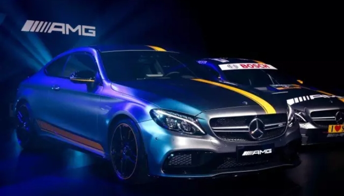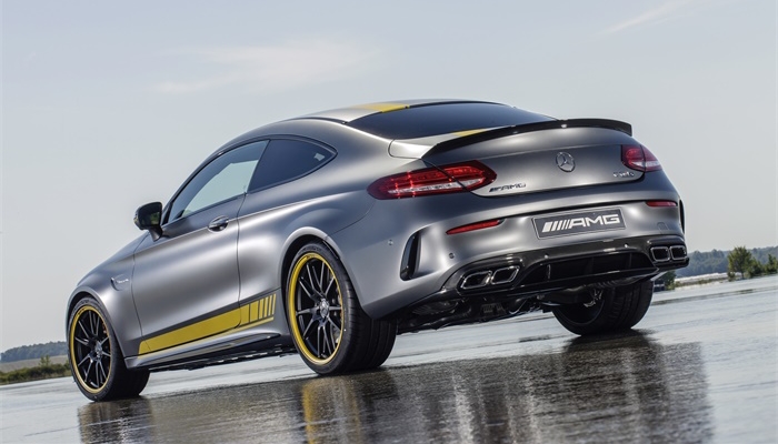 AMG C63轿跑限量版和一个月前同样在上海赛车场发布的C63轿跑相比,DTM赛车元素更突出,采用名为Designo的月光石哑光灰色车漆与明黄色涂装饰条进行搭配,外扩式前后轮拱和增大的轮距使其外观肌肉感十足,更具识别度。