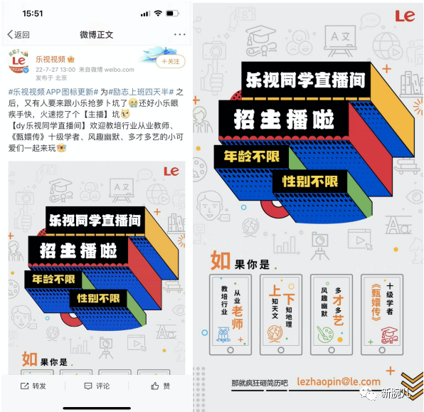 前有趣店,最近,乐视也下场做直播带货了。据相关媒体消息,自6月份东方甄选瞬间走火后,7月底,乐视视频发布了一则招募主播的微博。