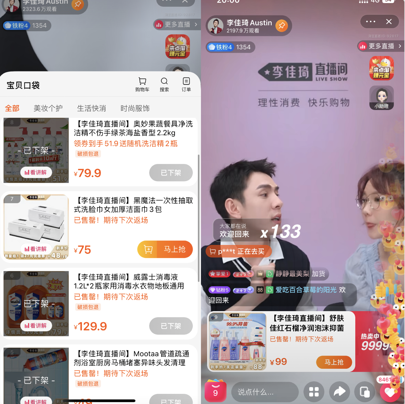 复播的过程中,甚至出现了一点小插曲,观众的涌入让直播间在19点03分掉线,当时画面出现了“直播已结束”字样,但三分钟内直播恢复,李佳琦解释称是由于“系统问题,有点卡顿”。