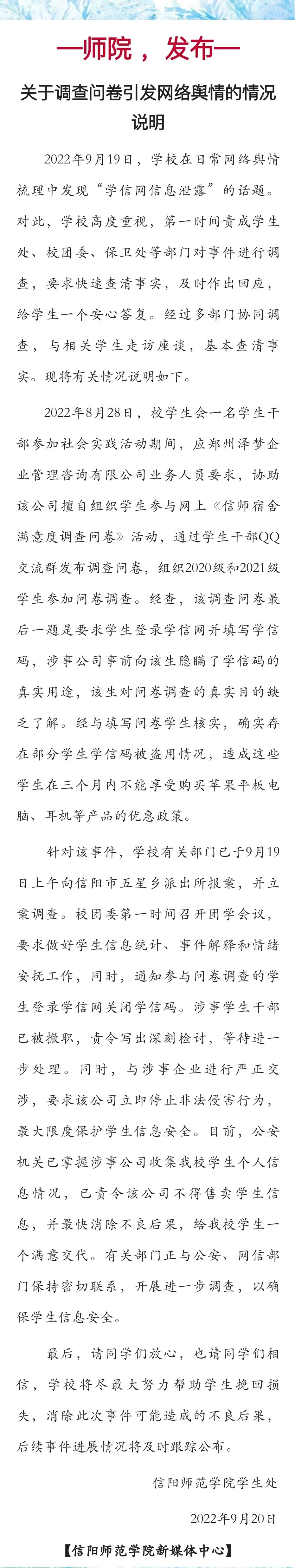 9月20日,@信阳师范学院 微博发布关于调查问卷引发网络舆情的情况说明。2022年9月19日,学校在日常网络舆情梳理中发现“学信网信息泄露”的话题。对此,学校高度重视,第一时间责成学生处、校团委、保卫处等部门对事件进行调查,要求快速查清事实,及时作出回应,给学生一个安心答复。经过多部门协同调查,与相关学生走访座谈,基本查清事实。现将有关情况说明如下。