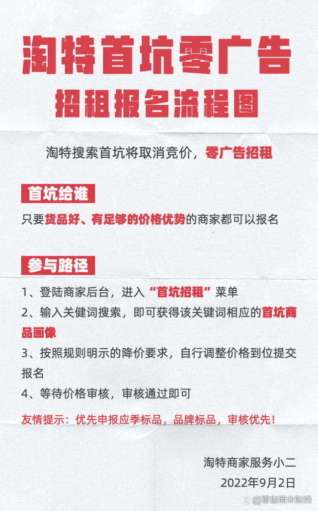 进入2022年9月,淘系电商重要成员——被视为下沉核心利器的淘特,低调取消首坑竞价。从淘特商家服务小二发布的“首坑免费招租”广告来看,只要商品好、有足够价格优势,就可以在淘特商家后台申请免费的首坑位。