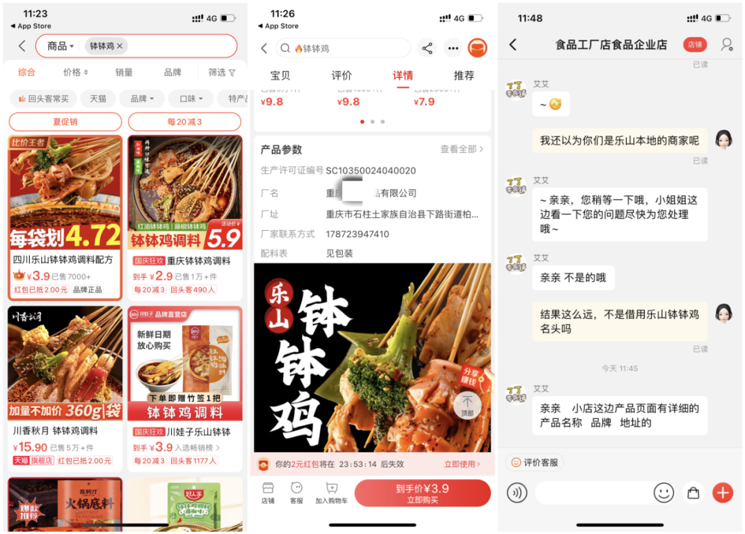“微博有大V推荐了淘特该款商品,我一直以为是乐山本地品牌商家。”消费者盈盈说,很多消费者像自己一样,冲着“乐山钵钵鸡”招牌去消费下单。