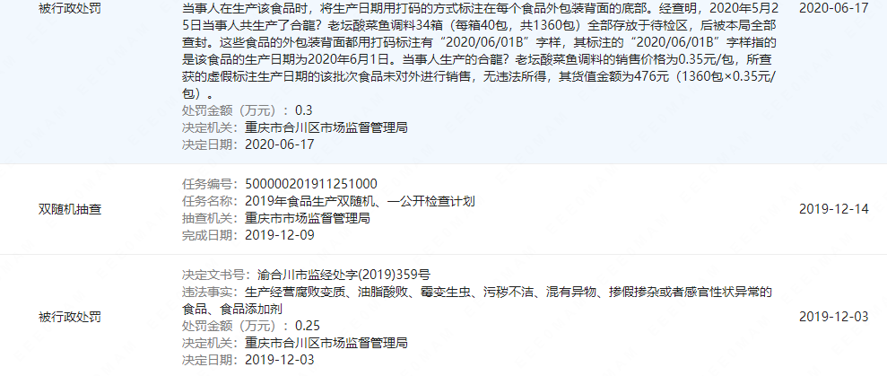 企查查显示,上述负责生产的食品公司注册资本20万元,参保人数4人。2019年以来,该公司被重庆合川区市场监督管理局、重庆市统计局、重庆市合川区规划和自然资源局等行政处罚十多次,包括生产经营腐败变质、油脂酸败、霉变生虫、污秽不洁、混有异物、掺假掺杂或者感官性状异常的食品、食品添加剂,以及(食品)虚假标注生产日期,(食品)定量包装商品净含量不合格等违法行为。其中,“乱劈才”商标生产的红油火锅底料也被行政处罚。
