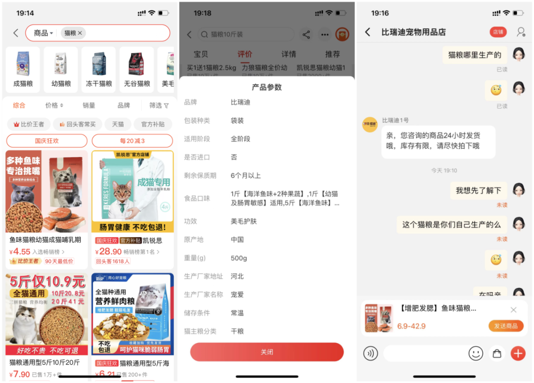 另一些“比价王者”品类,同样有可疑之处。比如搜索猫粮,首位“比价王者”商家的某款猫粮已销售3万多件。不过,该商店客服并未回答猫粮生产来源,淘特产品参数显示原产地为中国,生产厂家地址为河北、生产厂家名称为“宠爱”,没有任何实际生产地址可查询。